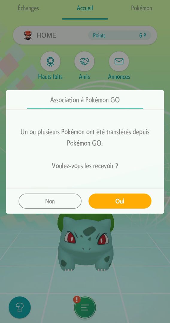 Si vous décidez de ne pas recevoir les Pokémon au démarrage de l’application, vous pourrez les recevoir à n’importe quel autre moment en allant dans le menu « Paramètres », puis en sélectionnant « Connexion à Pokémon GO », puis « Recevoir des Pokémon ». Notez toutefois que vous ne pouvez pas transférer de nouveaux Pokémon depuis Pokémon GO tant qu’il vous reste des Pokémon à recevoir dans Pokémon HOME.