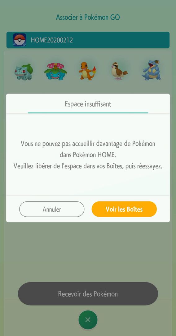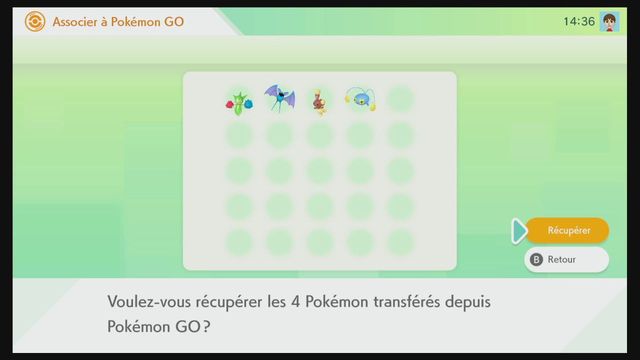 Si des Pokémon ont été transférés, vous pouvez sélectionner « Récupérer » afin de les envoyer dans vos Boîtes Pokémon HOME. Notez toutefois que vous ne pouvez pas transférer de nouveaux Pokémon depuis Pokémon GO tant qu’il vous reste des Pokémon à recevoir dans Pokémon HOME.