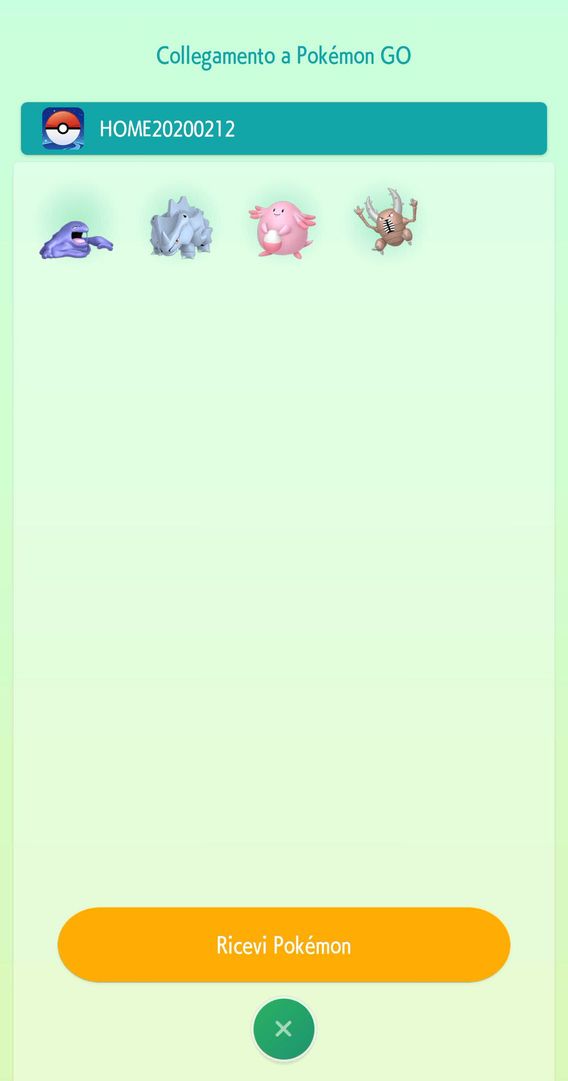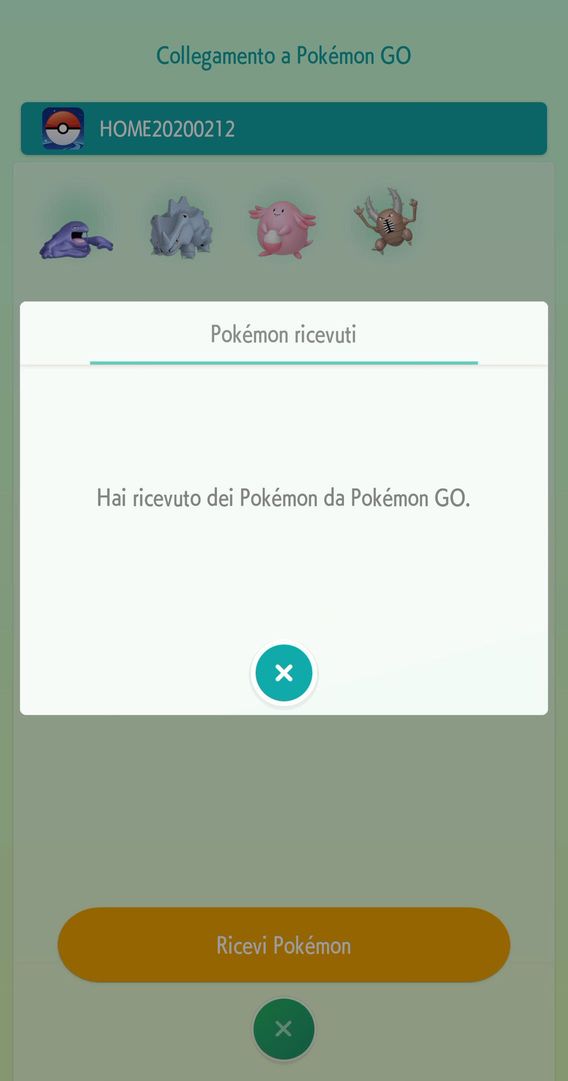Se sono presenti dei Pokémon che sono stati trasferiti, puoi selezionare Ricevi per inviarli ai tuoi Box Pokémon in Pokémon HOME. Se non hai ancora ricevuto i Pokémon che avevi già trasferito, non potrai trasferire altri Pokémon da Pokémon GO.